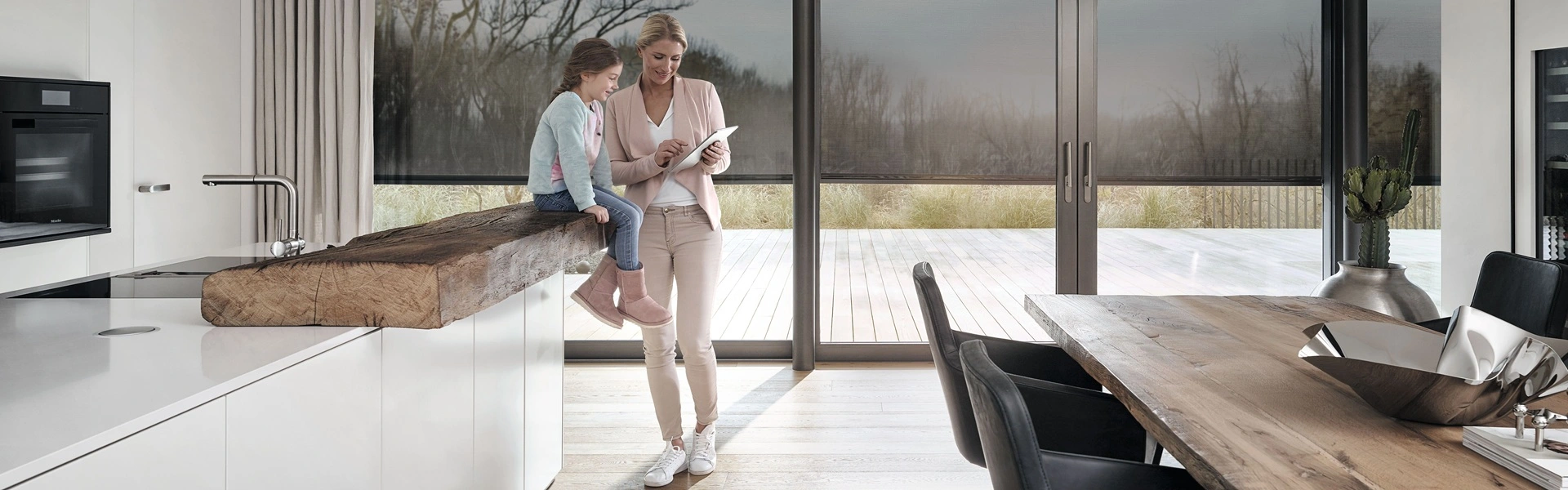 Vrouw bedient domotica in keuken met houten details en uitzicht op terras