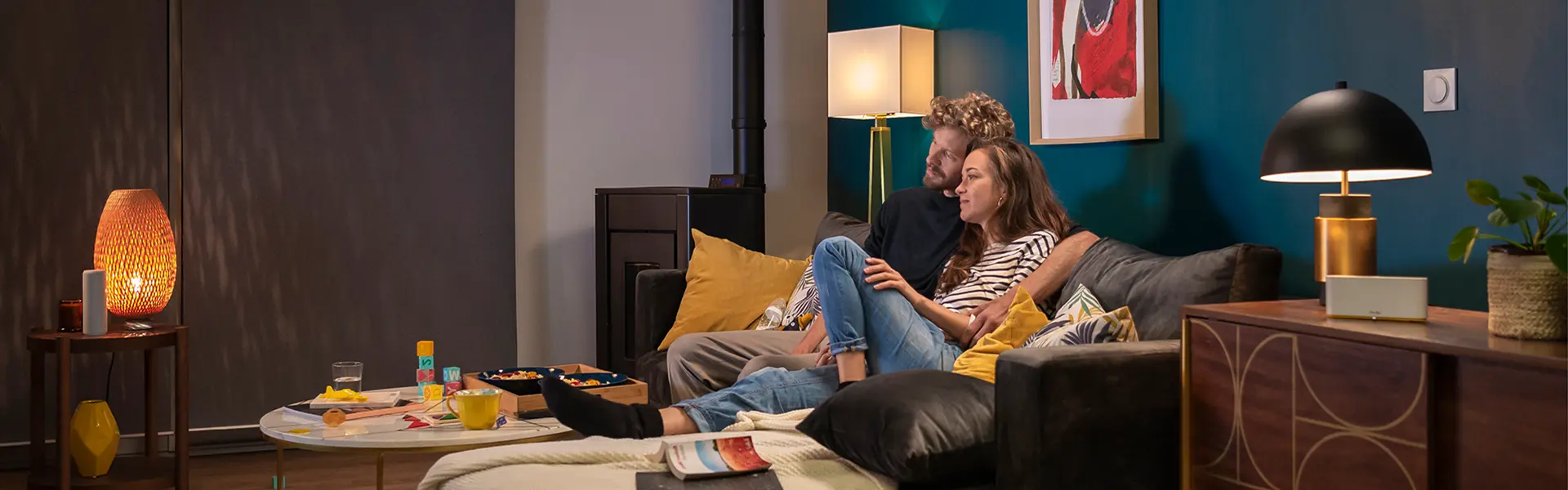 Man en vrouw zitten samen aan tafel met een Tahoma box met screens bij de ramen