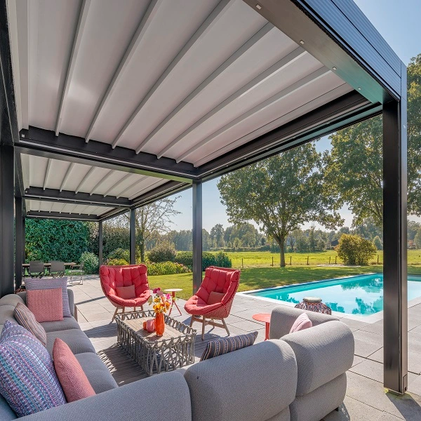 Gesloten aluminium overkapping Azimut met vouwdak en zwembad op achtergrond