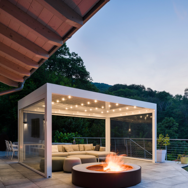 De glazen schuifwanden sluiten je overkapping af zonder het gevoel van ruimte te verliezen. Ze houden wind en regen buiten, en bieden je de flexibiliteit om je buitenruimte volledig naar wens te gebruiken.