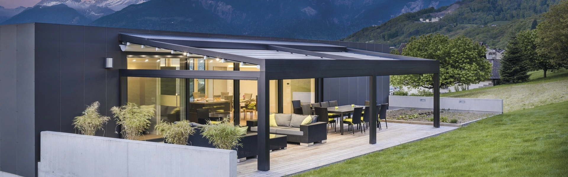 Quadra vouwdak overkapping met sfeerverlichting in bergachtige omgeving