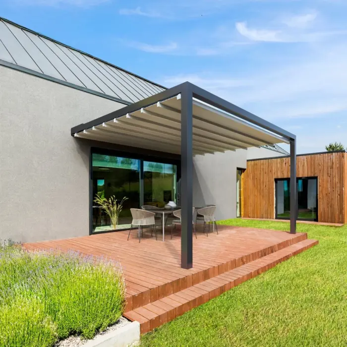 Je zit buiten met een kop koffie, de zon begint net door te breken, maar je wil niet meteen smelten onder de hitte. De LANI pergola vangt dat moment precies goed op. Met z’n rechte lijnen en slimme techniek zorgt deze overkapping voor precies genoeg schaduw, zonder dat het ten koste gaat van het uitzicht of het licht in huis.