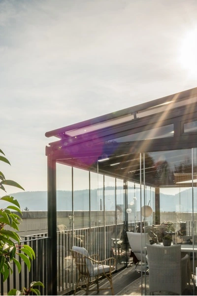 Bescherm je terras tegen de zon met de geïntegreerde oplossing onder op het dak, houdt het glas schoon en de temperatuur aangenaam.