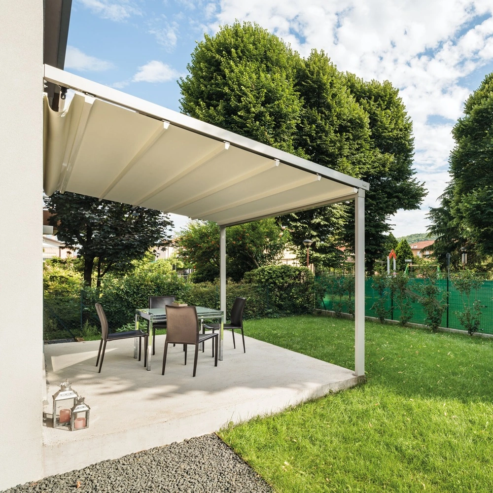 Of je nu een intiem terras hebt of een grote buitenruimte, de schuine overkapping met doek past altijd. Met een licht aflopend ontwerp voert deze overkapping regenwater efficiënt af, terwijl het UV-bestendige doek zorgt voor een koele en schaduwrijke plek.