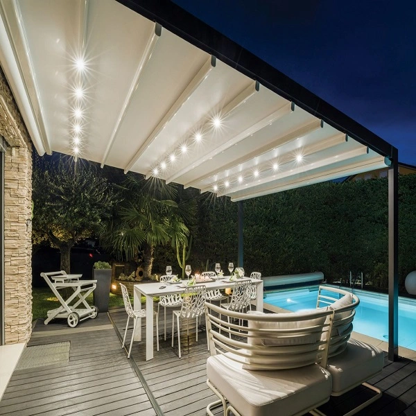 Schuine overkapping Luce met sfeerverlichting boven een terras bij een zwembad