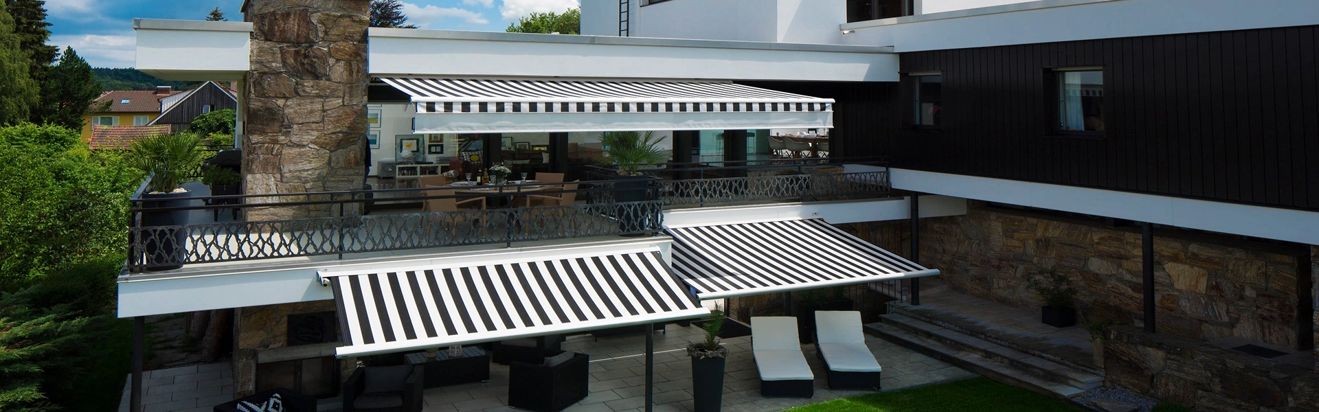 Cassette zonwering FINO met zwart-wit strepen op luxe terras