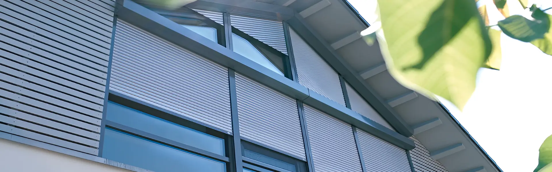 Close-up van solar rolluiken op schuin dak met ramen en glazen gevel